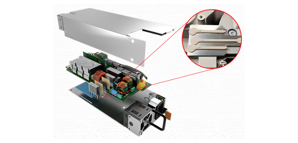 为云计算和超大规模数据中心设计的新型 AC/DC电源,需要为其紧凑型设计提供强大的热管理解决方案。整个设备的表面形貌各不相同,因此需要一种可适应变化的材料,在有限空间内,以最大限度地实现热传导,确保部件安全、散热并减少机械应力。